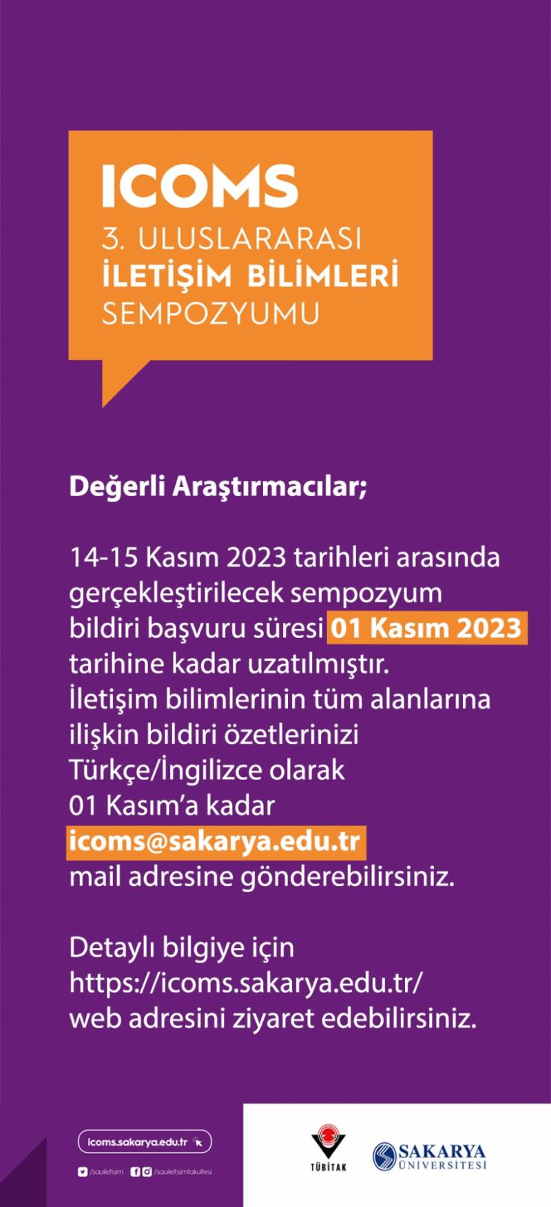 14-15 Kasım 2023 tarihlerinde gerçekleştirilecek III. Uluslararası İletişim Bilimleri Sempozyumuu için bildiri başvuru süresi 1 KASIM 2023 tarihine kadar uzatılmıştır. İletişim bilimlerinin tüm alanlarından başvuruya açık olan sempozyum için bildiri özetlerinizi 1 Kasım'a kadar icoms@sakarya.edu.tr adresine gönderebilirsiniz.